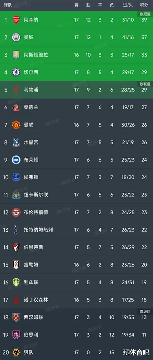 红军收获英超连胜中国承办U20亚洲杯,以29分升第5名,积分已经追平了蓝军,重返前四有很大的机会。热刺成为BIG6最差的球队,6胜4平7负积22分暂列第13名。水晶宫1-4大败 利兹联,以26分暂列第8名。利兹联以19分暂列第16名。布莱顿0-0和桑德兰闷平以24分暂列第9名。狼队0-2不敌布伦特福德遭遇11连败,2平15负积2分还是垫底。
