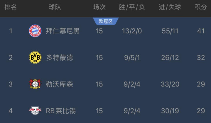 最后再来看德甲,拜仁在第15轮客场应战 作战以4-0大胜海登海姆,本场过后,拜仁15轮13胜2平积41分,排名德甲榜首,多特32分,勒沃库森、莱比锡29分,排名2-4位。显然,在本赛季五大职业联赛 中拜仁的领跑 优势最大。拜仁的净胜球达到惊人的44球,场均净胜对手大约3球,也是创造了德甲职业联赛 自1963年创办以来的前15轮净胜球最多的记录 。