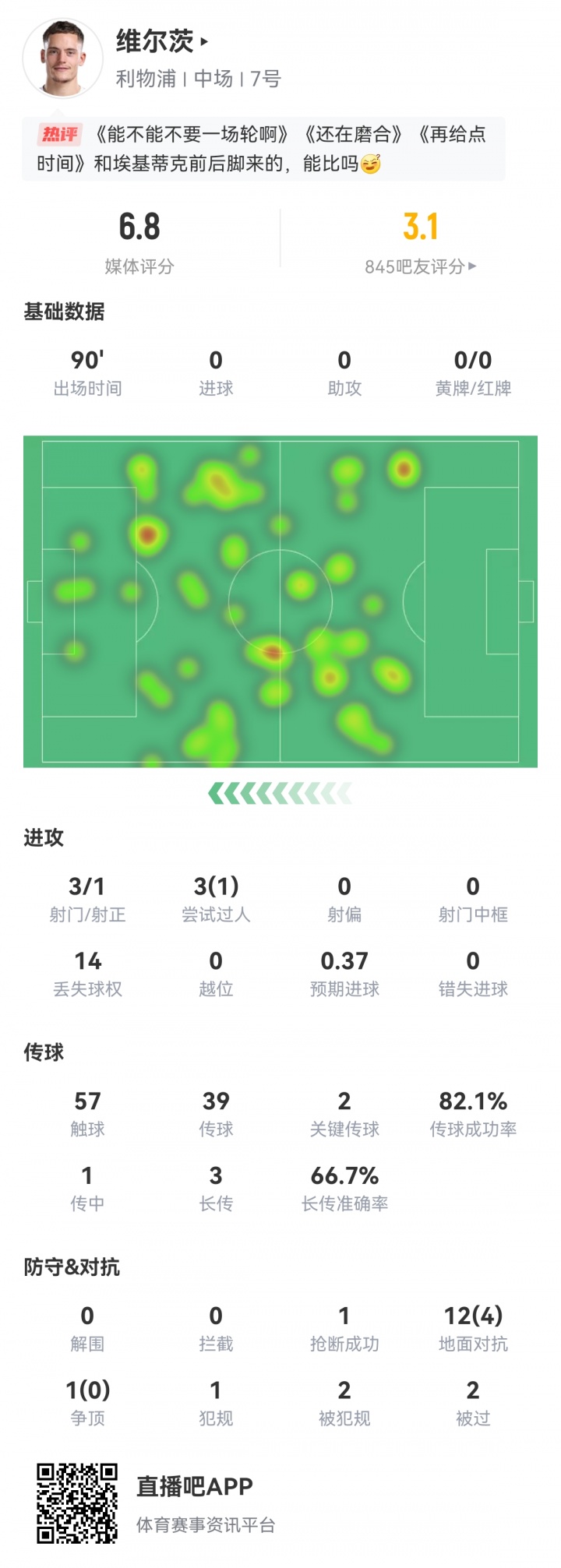 维尔茨未能展现出任何锐利度。这位德国国脚14次丢失球权,13次对峙 仅赢下4次(成功率31%)。下半场一次传送球 错误 后,欧洲杯直播吧他双手掩面——信心显然已遭受重挫。