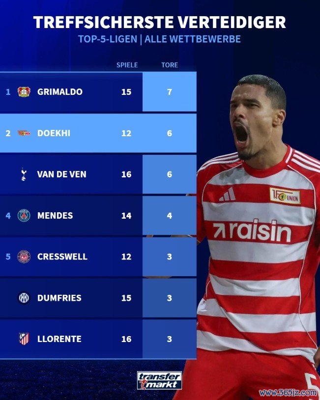 11月11日讯 欧洲五大职业联赛 有着一些带刀后场球员属性的球员,格里马尔多、多克希等人是其中的佼佼者,德国转会市场盘点了本赛季五大职业联赛 得分 最多的后场球员,欧洲杯直播格里马尔多以7球居首,多克希、范德芬以6球并列次席。