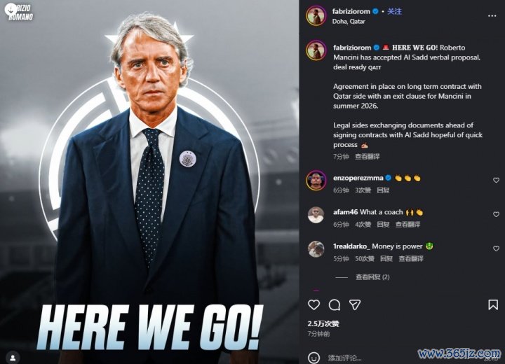 11月11日讯 名记罗马诺用标志性和“here we go!”确认,意大利籍主指导教练员曼奇尼将执教卡塔尔俱乐部阿尔萨德。