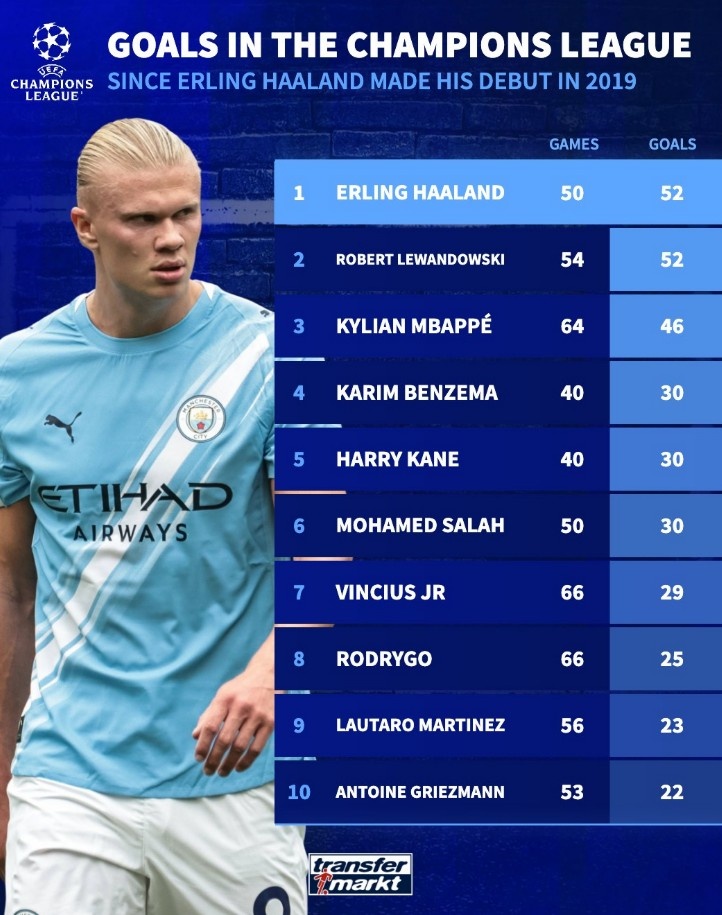 10月2日讯 在本轮欧冠曼城2-2战平摩纳哥的赛事 中,欧洲杯直播吧哈兰德连进两球。以下为自哈兰德2019年首秀以来欧冠得分 榜:
